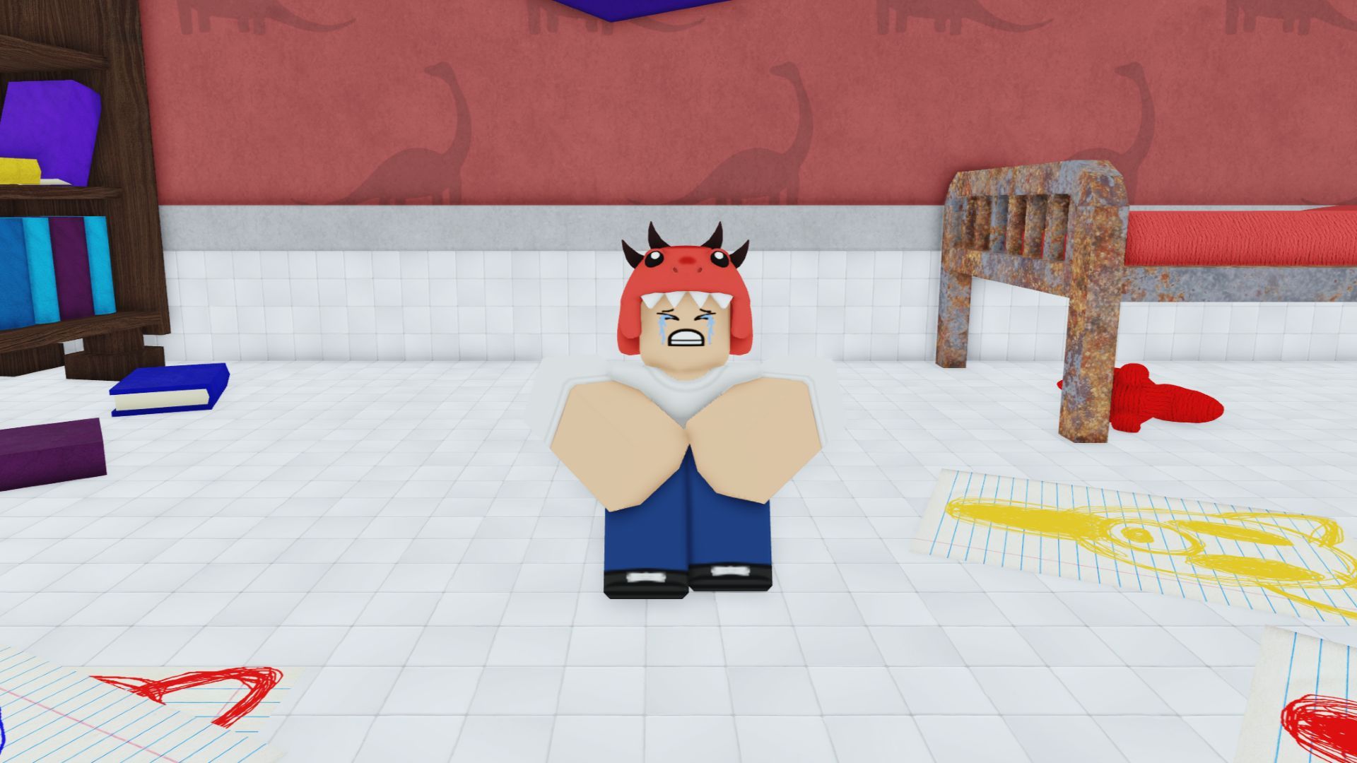 A lost kid sitting in a room crying from 99 Nights in the Forest.